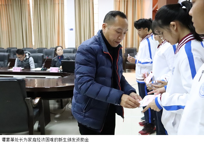 本网讯(学生处)为了激励广大学生刻苦学习,鼓励更多的优秀高中毕业生报考beat365和帮助家庭经济困难学生的困难,12月8日下午,学生处在高要校区行政楼101会议室举行2020级优秀高分新生奖学金及家庭经济困难新生资助金发放仪式。学生处谭蒙革处长、各院系学工部部长、辅导员代表及优秀高分新生奖学金获得者、家庭经济困难新生代表出席本次发放仪式。会议由学生处奖助贷科陈莹老师主持。