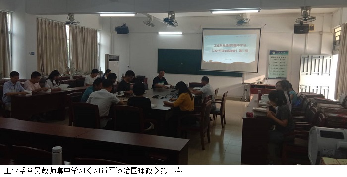 本网讯(工业系)9月25日下午,工业系党员教师在9304会议室,集中学习《习近平谈治国理政》第三卷。工业系党总支副书记苏庚华、教工党支部书记杨斌和全体党员老师出席本次会议。