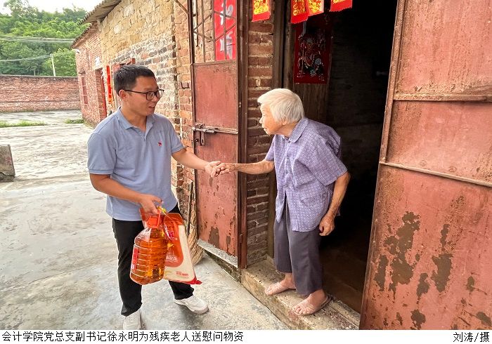 本网讯(会计学院新闻中心)为进一步弘扬中华民族扶弱助残的传统美德,积极响应国家政策的号召,倡导扶残助残的良好社会风尚,9月27日下午,会计学院党总支赴夏岗村开展了“扶残助困”慰问活动。参与此次活动的人员有会计学院党总支书记黎伯毅、党总支副书记徐永明、教工党支部书记郑春晓,教工党支部委员刘涛以及两位党员学生代表。