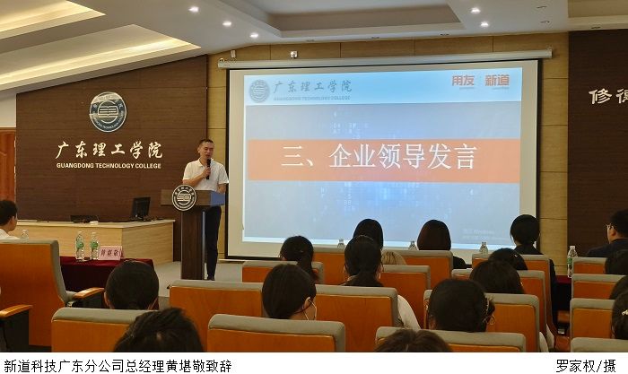 新道科技广东分公司总经理黄堪敬对学校和企业共建的数智会计产业学院模式进行了详细解读,强调为适应企业数字化转型的变革,产业学院将践行“把数智商业融入校园”,将新技术、新课程、新理念构建成新的教学体系,对接产业需求,培养行业紧缺人才。