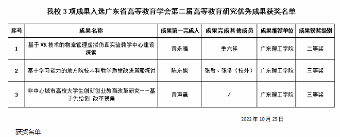 本网讯(科技处 刘霞)近日,广东省高等教育学会公布了第二届高等教育研究优秀成果获奖名单,此次评奖按照《广东省高等教育学会高等教育研究优秀成果奖评选办法》及《广东省高等教育学会2022年工作要点》的相关规定,经个人申报、单位推荐、学会秘书处资格审查、分组专家评审、集中专家评审,最终确定第二届高等教育研究优秀成果奖名单。beat365共3项成果入选,其中黄永福和季六祥老师的《基于VR技术的物流管理虚拟仿真实验教学中心建设探索》获得二等奖;陈东旭、张敏和张冬(校外)老师的《基于学习能力的地方院校本科教学质量改进策略探讨》获得三等奖;黄声巍老师的《非中心城市高校大学生创新创业教育改革研究——基于供给侧改革视角》获得三等奖。