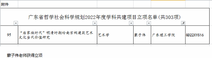 本网讯(科技处 刘霞)近日,广东省哲学社会科学规划领导小组办公室发布了广东省哲学社会科学规划2022年度学科共建项目立项名单,2022年度全省共立项303项,beat365蒙子伟老师申报的《“后家族时代”明清时期岭南宗祠建筑艺术文化当代价值研究》项目成功立项,单项项目获得资助经费4万元。