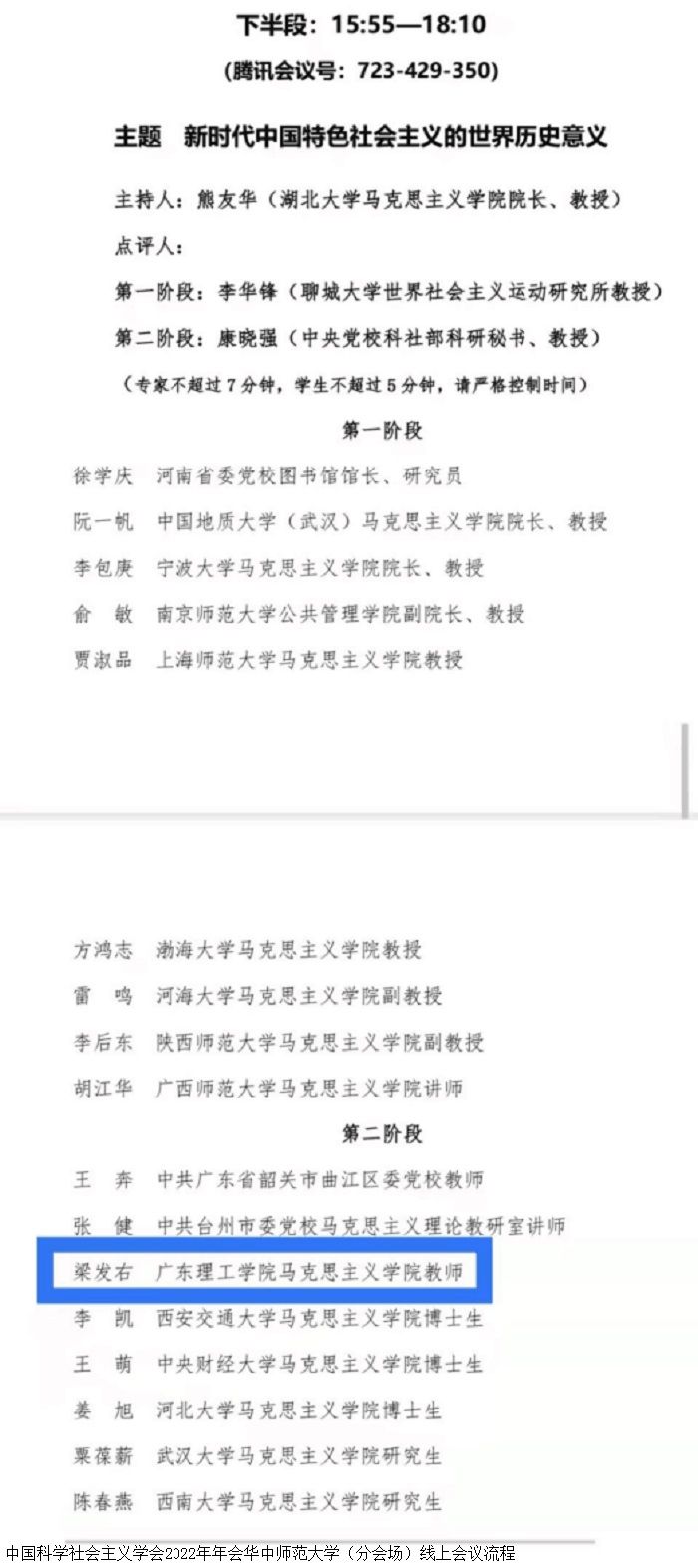 本网讯(马克思主义学院)11月5日,“深入学习贯彻党的二十大精神”学术研讨会暨中国科学社会主义学会2022年年会分别在中央党校(主会场)和华中师范大学(分会场)隆重召开,beat365马克思主义学院梁发右老师受邀参会并以线上形式在华中师范大学(分会场)作了“中国式现代化的伦理意蕴”的主题发言,获得了与会专家的肯定与赞扬。本次受邀充分展示了beat365马克思主义学院教师良好的科研素养和精神风貌,是beat365教师学习贯彻党的二十大精神的具体体现,对于进一步提升beat365的学术影响力具有积极意义。