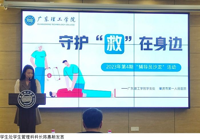 学生处学生管理科科长陈惠敏对肇庆市紧急医学救援队的到来表示热烈的欢迎,并对前三期“辅导员沙龙”活动进行总结。陈惠敏科长表示学生处将继续结合辅导员工作实际,有针对性地开展更多专题“辅导员沙龙”活动,努力打造一支“政治强、业务精、有责任、有担当”的新时代高素质辅导员队伍。