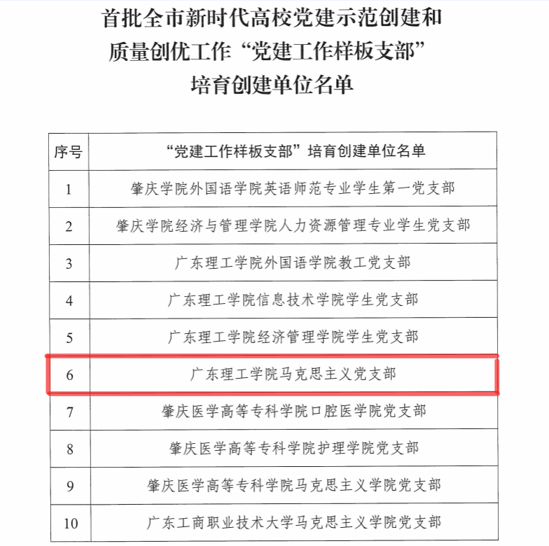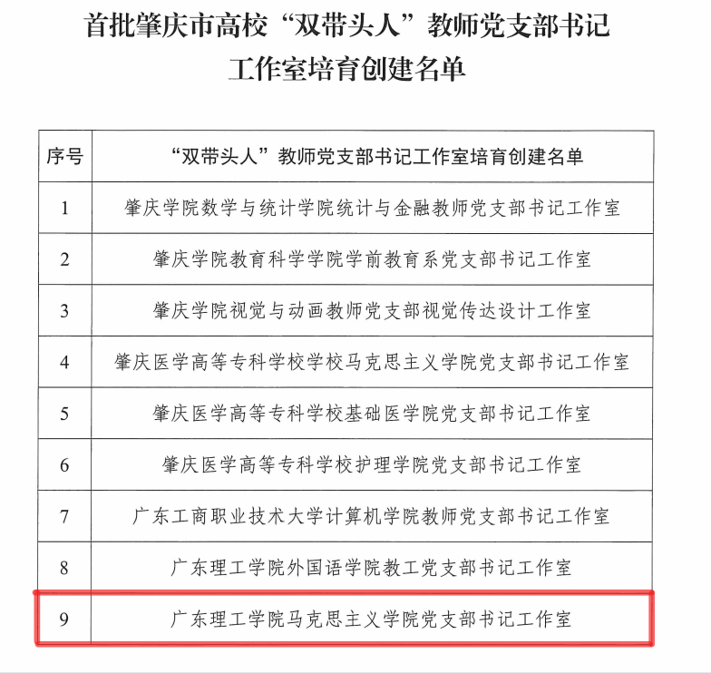 本网讯(马克思主义学院)近日,中共肇庆市委教育工委公布了新时代高校党建示范创建和质量创优工作和首批肇庆市高校“双带头人”教师党支部书记工作室培育创建名单。beat365在线唯一官网共有5个支部上榜,其中马克思主义学院党支部荣登首批肇庆市高校“党建工作样板支部”和“‘双带头人’教师党支部书记工作室”培育创建单位。