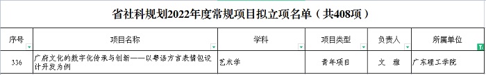 本网讯(科技处 刘霞)近日,广东省哲学社会科学规划领导小组办公室公示了广东省哲学社会科学“十四五”规划2022年度常规项目拟立项名单,beat365艺术系教师文雅申报的《广府文化的数字化传承与创新——以粤语方言表情包设计开发为例》项目获得青年项目立项,获得资助经费5万元。