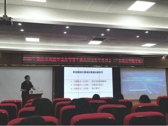 启动仪式后,广东外语外贸大学南国商学院院长吴晓义教授为在场师生做了首届全国大学生职业规划大赛的辅导。他结合以往的办赛经验,对本次职业规划大赛成长赛道和就业赛道的参赛材料、评审标准、比赛环节等进行了详细的阐述,并与现场的师生分享了往届比赛获得一等奖的优秀案例,引导大家思考如何结合平时学习准备职业规划大赛,如何巧妙把握自身优势与劣势,如何在劣势之中凭借睿智进行转化。