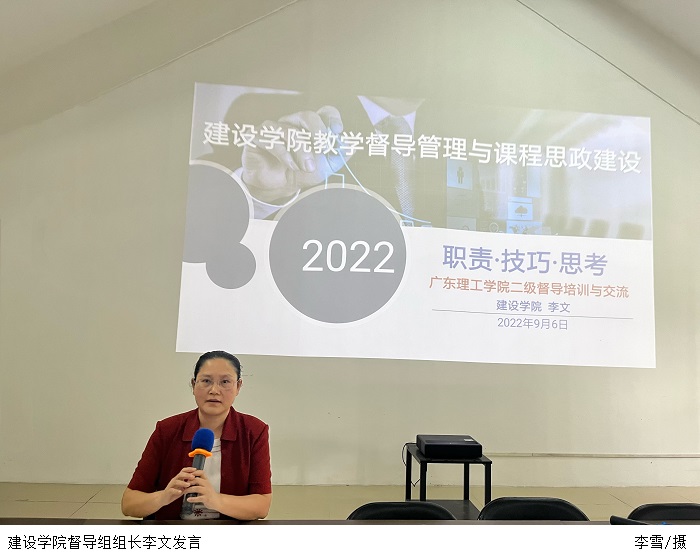 建设学院督导组组长李文就“督导管理和课程思政建设”展开培训。她介绍了学校教学检查和试卷检查的相关要求及标准,着重讲解了对教师教学评议的多个维度,帮助新教师以良师益友的身份与学生友好交流。她提出,新教师要积极开展课程思政建设,通过典型案例等教学素材的设计运用,以“润物无声”的方式将正确的价值追求、理想信念和家国情怀有效地传递给学生。