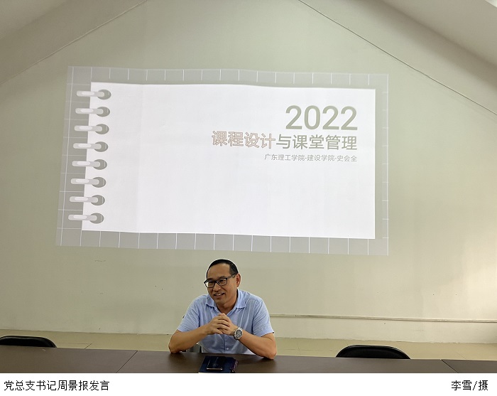 党总支书记周景报就新教师思想政治教育和课程教育进行细致讲解。他强调,作为人民教师,要自觉提高政治站位,通过一言一行体现教师良好的职业道德。同时,新教师要自觉做好角色转变,切实提高业务能力和水平,紧紧围绕课程内容进行积极向上的课程思政建设。他号召新教师能够积极配合学院学工和疫情防控工作,努力营造团结的集体氛围。