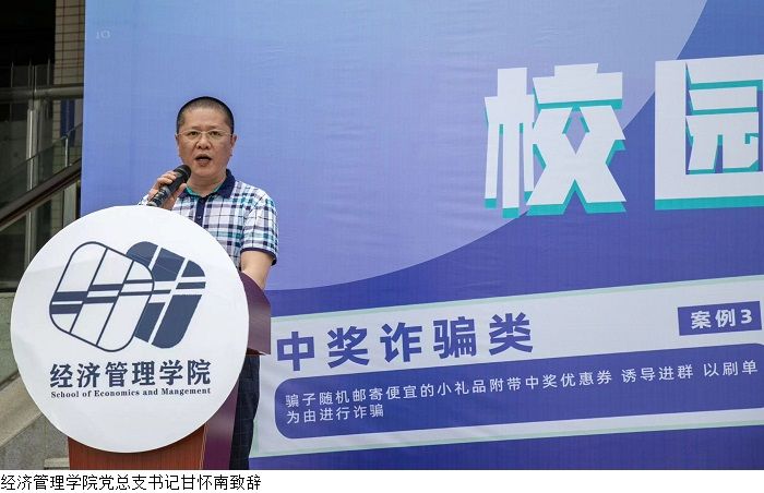 本网讯(经济管理学院 魏枫玲)为提高经济管理学院师生对网络诈骗的认知度,提高全院师生对防骗的警惕性,3月28日下午,经济管理学院于行政楼前开展“经管争做先锋,筑牢反诈防线”反诈主题宣讲活动,经济管理学院党总支书记甘怀南,学校学生处科长欧阳德,经济管理学院党总支副书记吴楚升,学工办主任魏甫龙,学生第四党支部书记赵静静,学生会指导老师涂世会,新闻中心指导老师胡靖伟,易班学生工作站指导老师谢漫钗、何绮珊,辅导员老师侯小孩、王晋斌参加活动。同时,活动特邀坑口派出所所长谢绍祺进行防诈宣讲。