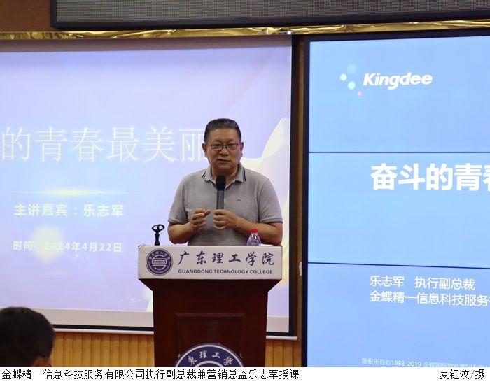 本网讯(会计学院 徐伟)2024年4月22日下午,会计学院在42栋101会议室成功举办了“科技赋能:智能财务变革与学生职业双轨并进”讲座。金蝶精一信息科技服务有限公司执行副总裁兼营销总监乐志军先生主讲。会计学院院长盛洁,金蝶精一信息科技服务有限公司华南区总监魏佳丹先生和校企合作经理何锦漫女士,会计学院2021级学生辅导员代表及学生约190人参加了此次活动。活动由会计学院党总支副书记徐永明主持。