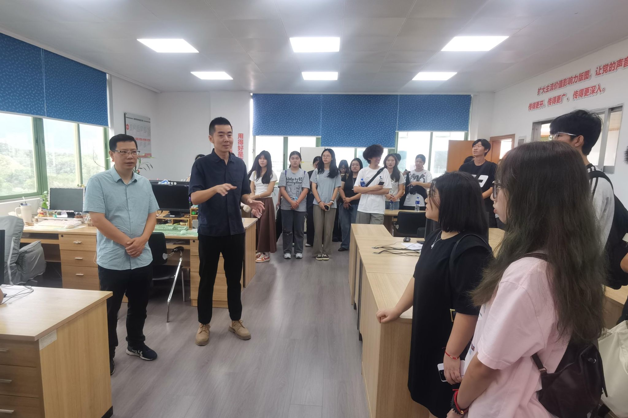 在肇庆市融媒体中心四楼,市融媒体中心办公室副主任覃鹏向师生们介绍市融媒体中心成立背景,带领师生实地参观了选题策划、新闻采编、视频制作、编辑工作以及新闻发布等工作区域。在八楼,市融媒体中心新媒体部负责人刘小洪介绍了部门基本情况及办公环境。通过实地参观和亲身体验,师生们不仅对新媒体的运作模式和技术应用有了更加直观的认识,同时也深刻体会到融媒体工作的专业性、严谨性和复杂性。