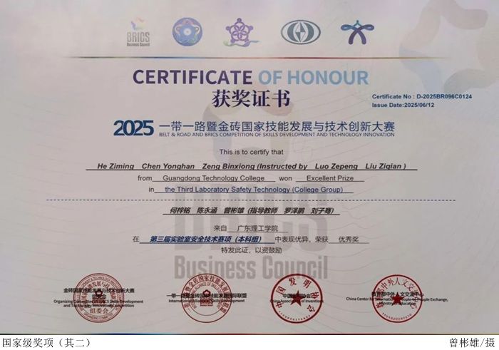 本次赛事成果不仅彰显了广理学子的专业风采,更印证了学院在高素质应用型人才培养方面的探索成效。我院将以此次获奖为契机,持续深化产教融合与实践教学改革,激励更多学子在学科竞赛中锤炼技能、展现担当,为推进实验室安全技术创新与行业高质量发展输送更多复合型人才。