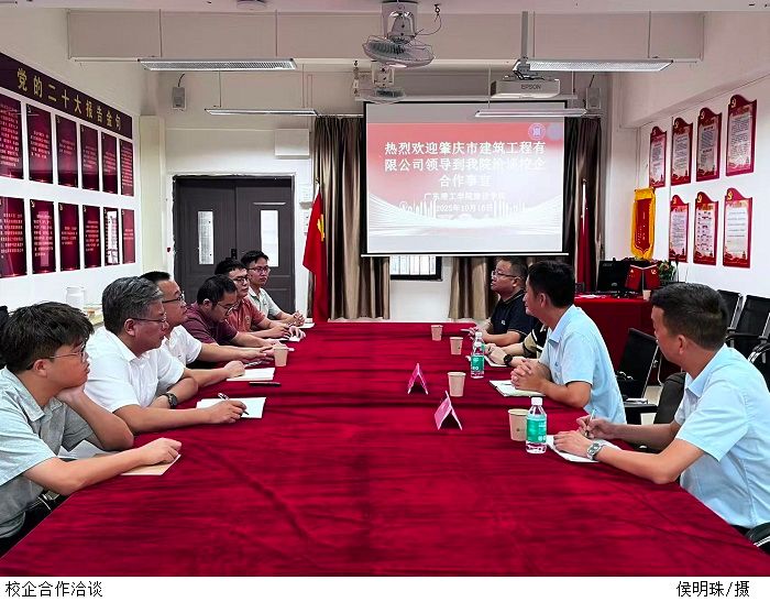 本网讯(建设学院 侯明珠)为深入贯彻落实国家关于深化产教融合的战略部署,精准对接人才培养与产业需求,10月16日下午,肇庆市建筑工程有限公司(以下简称“肇庆建工”)总工程师张劲欣、技术中心主任欧阳建新一行莅临我院,与建设学院副院长王金歌、建设学院副院长吴晓锐以及土木教研室骨干教师在3210会议室就校企合作等事宜进行了初步洽谈。