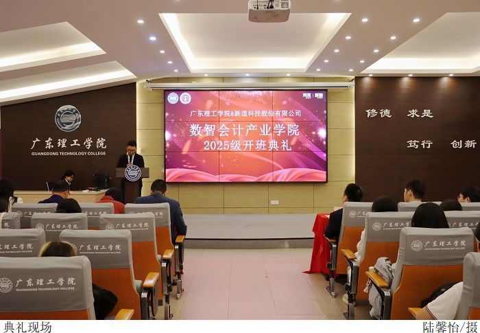 本网讯(会计学院融媒体中心 宋晨曦)为深化产教融合、系统培育具备数字技术应用能力、财务专业素养与战略决策思维的复合型财会人才,2025年11月18日下午15时,数智会计产业学院在鼎湖校区行政楼学术报告厅举行2025级开班典礼。出席本次活动的企业领导有新道科技股份有限公司广东分公司总经理董丙涛、战略客户总监王光思、服务总监徐启超、教学服务经理黄云建,学校领导有beat365在线唯一官网副校长舒程、会计学院院长盛洁、党委书记彭清林、副院长吴丽丽、数智财管教研室主任刘雄杰、数智会计教研室主任侯昊林。本次活动由党委副书记徐永明主持。