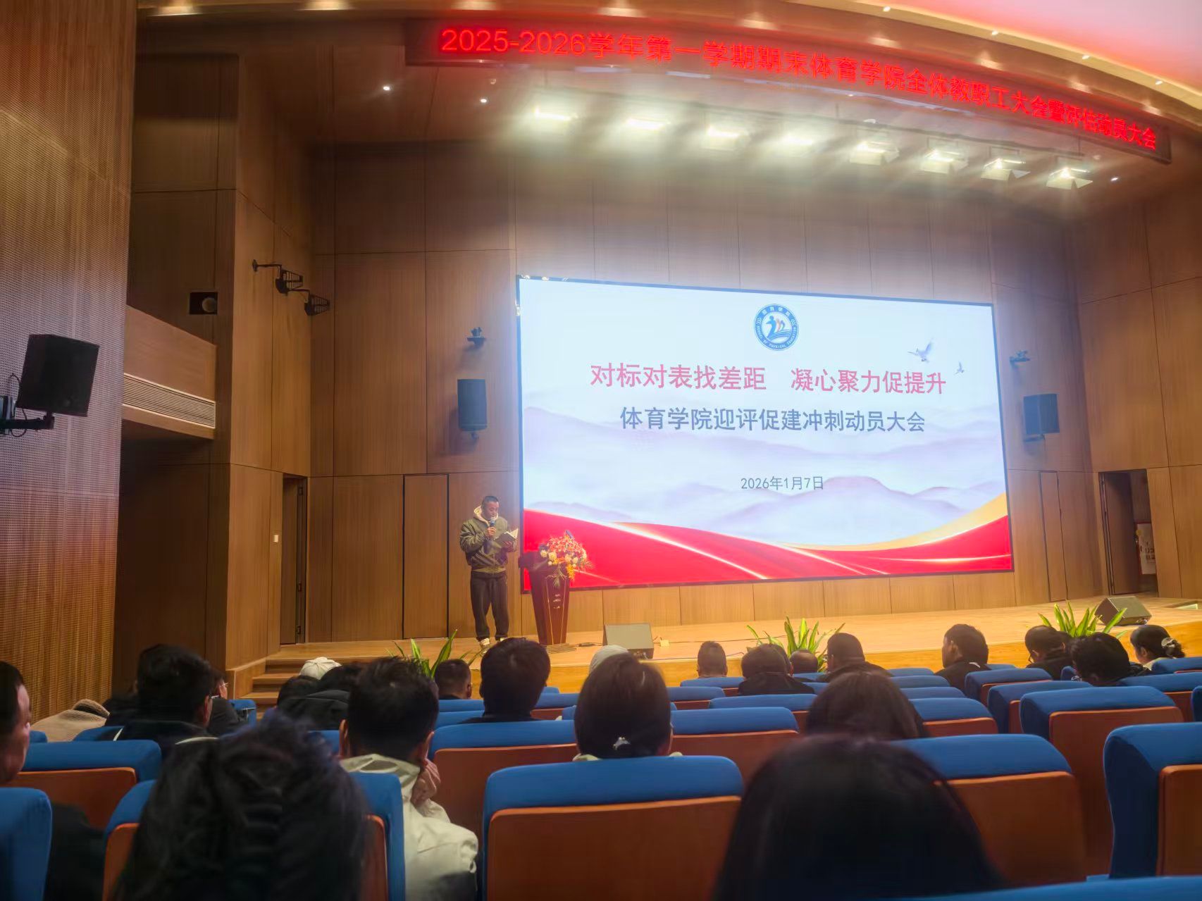 本网讯(体育学院 梁洁晶)为全面吹响本科教学工作合格评估冲刺号角,统筹推进学院各项重点工作落地见效,2026年1月7日下午,体育学院在学生活动中心1楼报告厅召开2025-2026学年第一学期全体教职工大会暨评估冲刺动员大会。会议由学院党委副书记刘涛主持,参加此次会议的有学院党委书记苏庚华、院长肖斌、副院长王群英、杨波及其余全体教职工。会议聚焦评估冲刺关键任务,围绕党建工作、学风建设、教学工作、校内外竞赛及本科教学工作合格评估冲刺阶段工作等核心议题进行全面总结与系统部署。