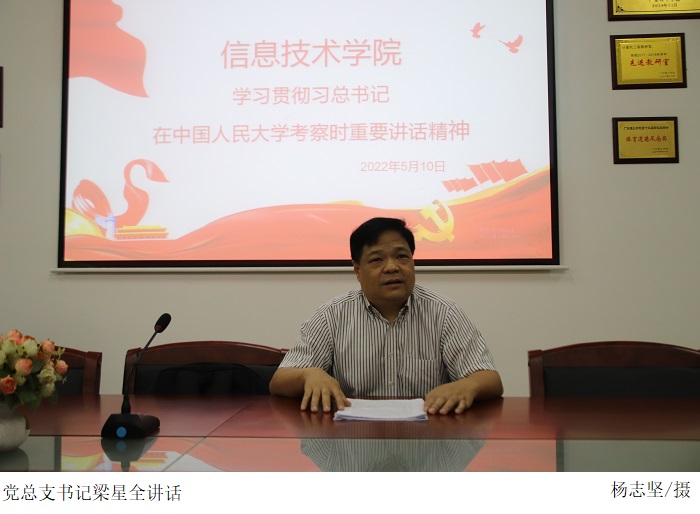 本网讯(信息技术学院 王诗琳)根据学校党委的统一部署和要求,5月10日下午,信息技术学院全体教职工在42203室召开深入学习贯彻习近平总书记在中国人民大学考察时重要讲话精神研讨会。本次学习研讨会采取线上(腾讯会议)与线下相结合的方式开展。