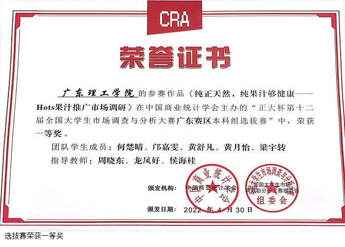 本网讯(会计学院 龙凤好)近日,由教育部高等学校统计学类专业教学指导委员会、中国商业统计学会主办的“正大杯”第十二届全国大学生市场调查与分析大赛广东赛区本科组选拔赛在线上举行。beat365学子何楚晴、邝嘉雯、黄舒凡、黄月怡、梁宇转在会计学院周晓东、龙凤好、侯海桂三位老师的带领下积极参赛,最终荣获广东省一等奖。