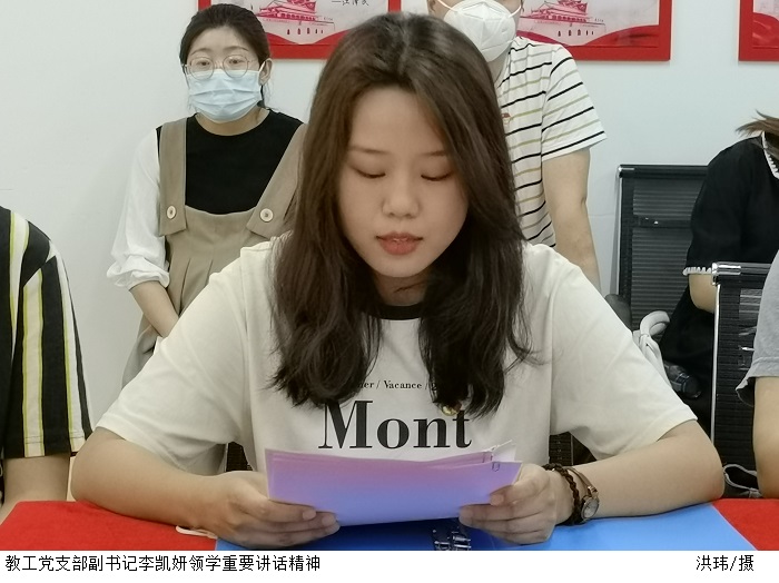 教工党支部副书记李凯妍领学习近平总书记在参加内蒙古代表团审议时的重要讲话精神,指出党员教师要认真学习贯彻习近平总书记重要讲话精神,结合校园疫情防控,慎终如始抓好新冠肺炎疫情常态化防控。