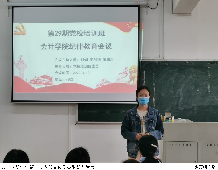 本网讯(会计学院学生党支部先锋队 林黎芝)为加强党校培训班的纪律建设,优化校园纪律作风,在学校党委和会计学院党总支的统一部署下,4月18日中午,会计学院学生第一、第二党支部在7202课室召开党校培训班纪律教育会议。学生第二党支部书记刘娟、学生第一党支部组织委员李剑钧和宣传委员张朝君以及第29期党校培训班成员参会。