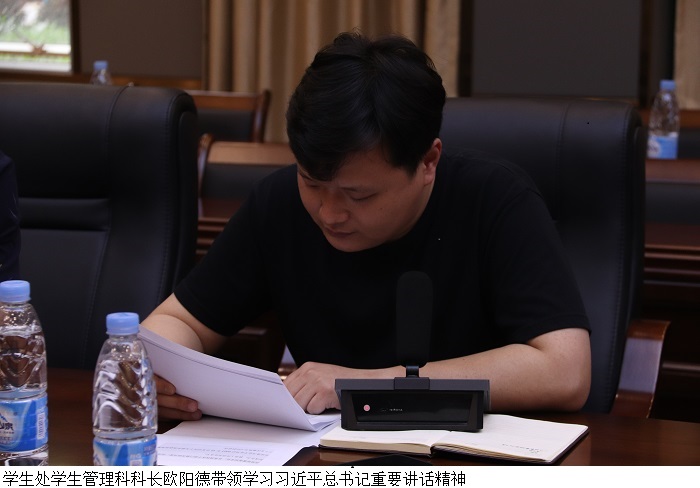 会上,学生处学生管理科科长欧阳德领学习近平总书记在中央政治局进行的第三十五次集体学习中的重要讲话精神。欧阳德科长在分享学习心得中表示,党员干部要带头尊法学法守法用法,引导广大师生自觉守法、遇事找法、解决问题靠法。