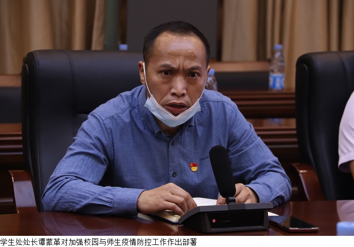 学生处处长谭蒙革对进一步加强校园与师生疫情防控工作作出具体部署。谭蒙革处长表示,全体党员干部务必落实职责分工,做到履职尽责,加强与所在地政府及卫生健康部门、疾控医疗机构的沟通联系,有针对性地开展突发疫情应急演练,完善应急措施方案,时刻紧绷疫情防控这根弦,克服松懈麻痹思想,从严从紧落实细常态化疫情防控措施。