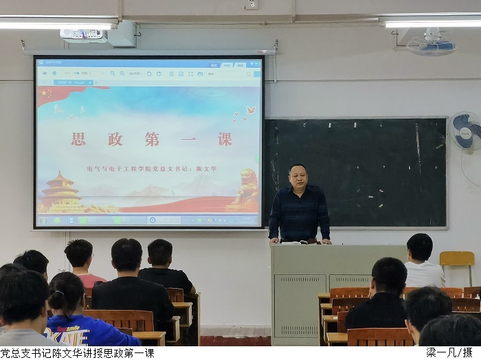 本网讯(电气与电子工程学院 叶运黎)为深入学习党的十九届六中全会精神和党的百年奋斗历史经验,进一步深化拓展党史学习教育,3月17日下午,电气与电子工程学院党总支书记陈文华在5202教室以《做新时代青春奋斗者》为主题,为学生入党积极分子开讲思政第一课。