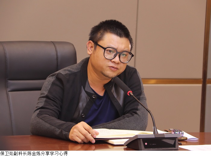 保卫处副科长陈金炼结合自身工作实际情况分享党史学习教育的心得体会。他表示,作为党员教师要做好本职工作,奉献比别人多一点、业务比别人精一点、贡献比别人大一点,更好发挥党员先锋模范作用。