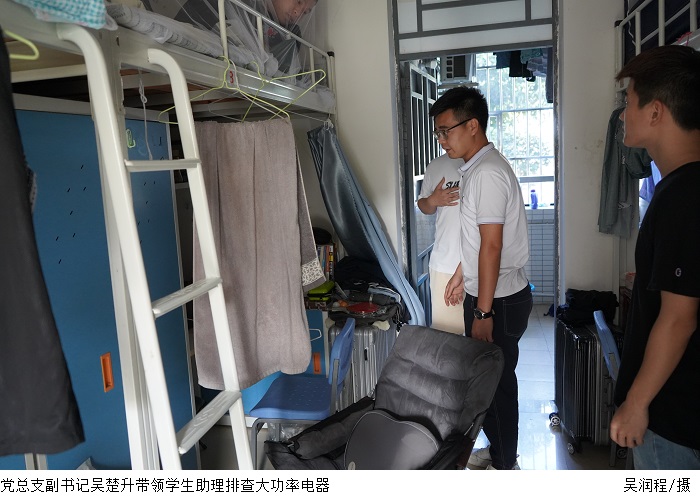 检查期间,辅导员对学生进行了宿舍用电安全教育,他强调了使用违规电器的危险性,学生应该提高用电安全意识。