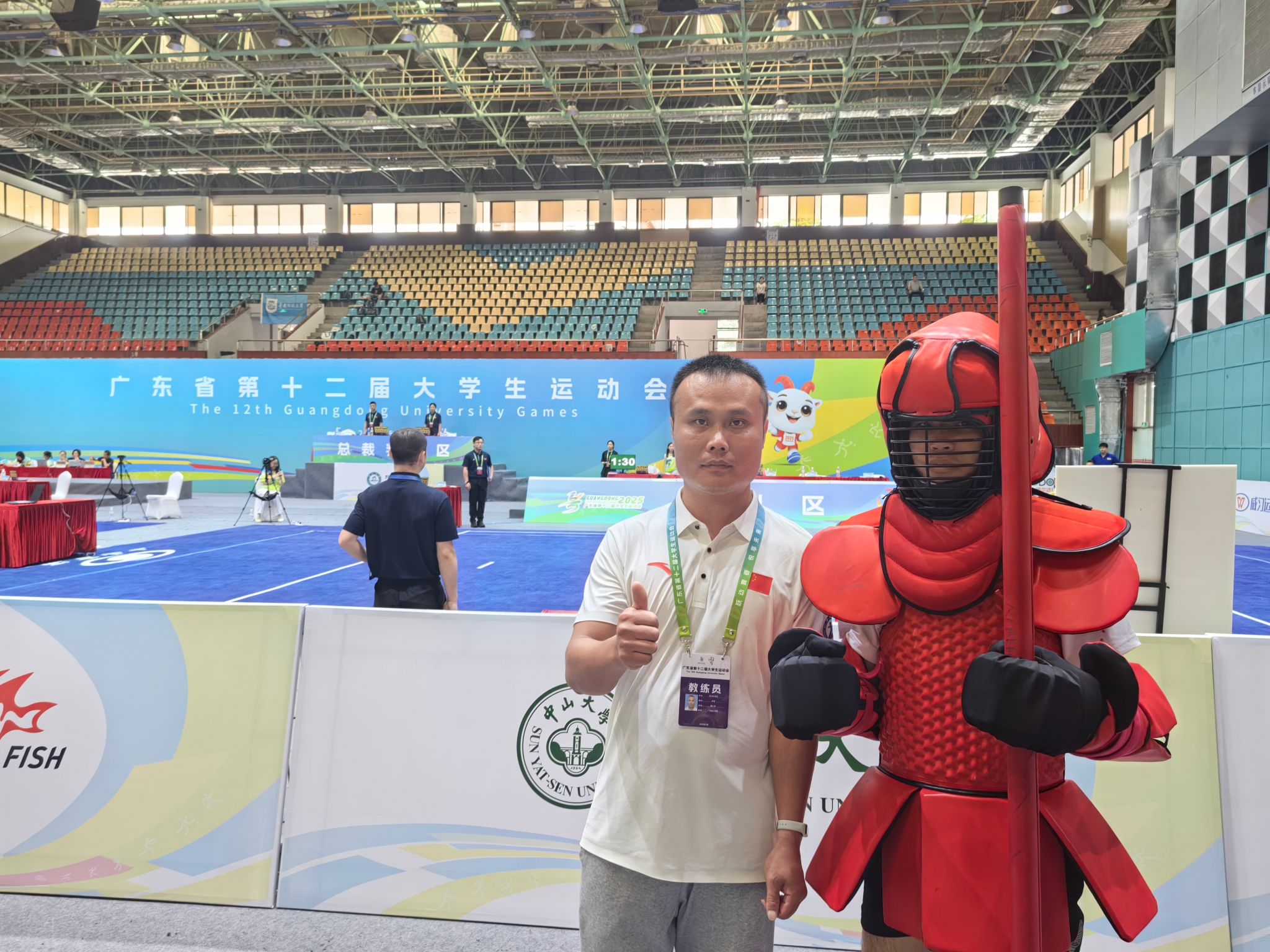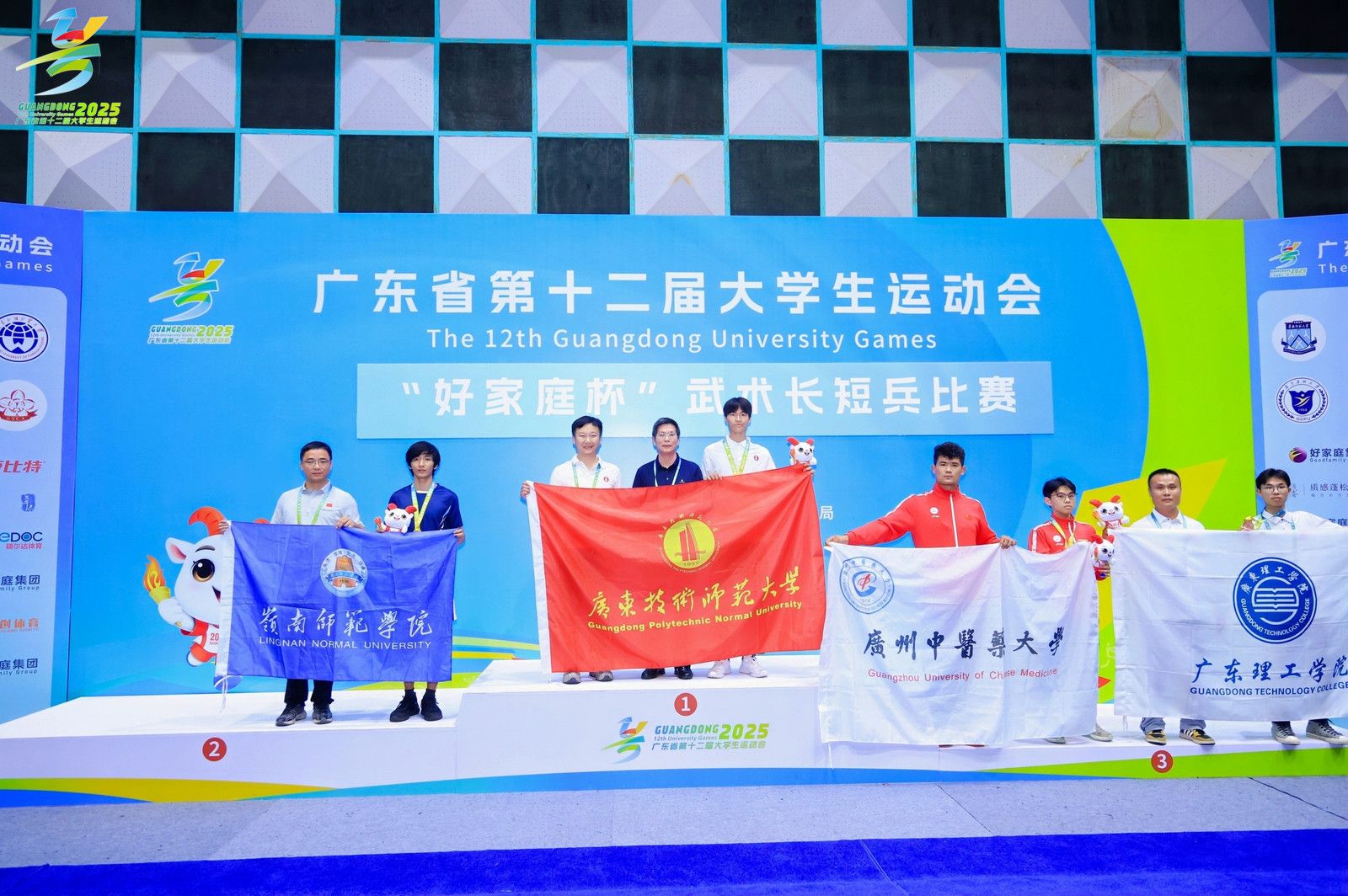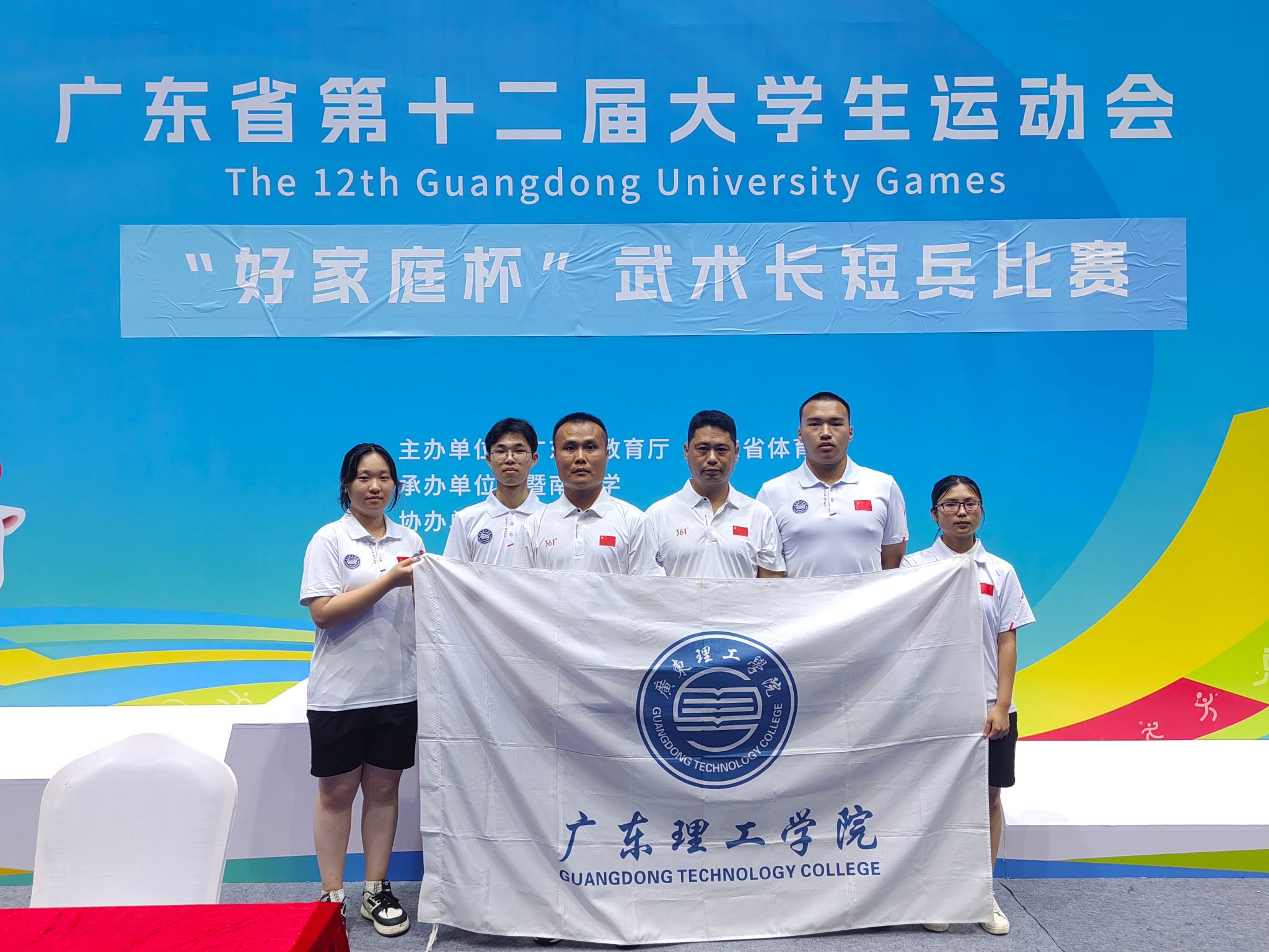 本网讯(体育学院新闻中心)5月19日至21日,广东省第十二届大学生运动会武术(长短兵)比赛在暨南大学(石牌校区)隆重举行。本次赛事由广东省教育厅、广东省体育局联合主办,是省内高校武术长短兵项目的最高水平竞赛,吸引了来自全省32所高校的120余名运动员同台竞技。beat365代表队由赵宁书记担任领队,谢小龙、刘海粟两位老师担任教练,带领4名运动员参加甲组各项目级别的角逐。经过激烈比拼,beat365赖子良同学在男子长兵62kg级比赛中力克广东技术师范大学选手,勇夺铜牌。此外,刘海粟老师与杨迪茵同学凭借出色的赛场表现和良好的体育精神,荣获“体育道德风尚奖”。