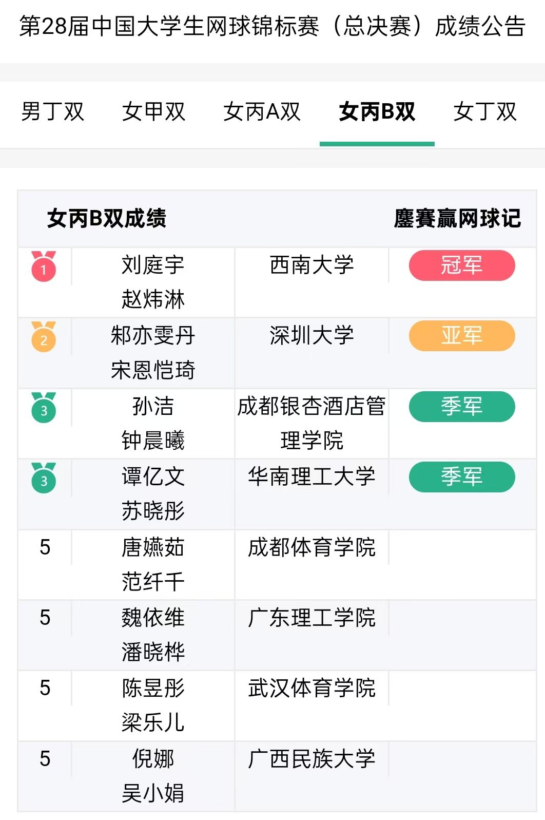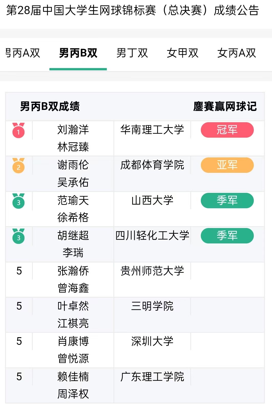 本网讯(新闻中心)8月16日至23日,第28届中国大学生网球锦标赛(总决赛)暨第23届中国高校“校长杯”网球比赛“星月安防杯”在湖北京山隆重举行。本届赛事汇聚全国百余所高校1500余名选手,竞争激烈、水平高超。beat365在线唯一官网网球队团结拼搏,实现多项历史性突破:周泽权/赖佳楠荣获丙B组男子双打全国第五,魏依维/潘晓桦斩获丙B组女子双打全国第五,四位队员获国家二级运动员认证资格,丙B组男子团体晋级全国24强。这是beat365首次在男双、女双两个项目同时跻身全国前五,刷新队史最佳战绩。