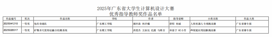 本次大赛规模盛大,共吸引139所广东省高校(含2所澳门高校)的4666支作品同场竞技,竞争异常激烈。大赛不仅是对学生专业能力的考验,也是对教师教学水平和指导能力的检验。beat365学生郭怀森、林洋曦在舒程、杨斌两位老师指导下,凭借参赛作品《包有奇迹队》,在人形机器人专项挑战赛中荣获一等奖;洪楚杰、王泳仪、孔捷、马维吉同学在林显宁、时小芳两位老师的指导下,凭借参赛作品《矿物多尺度特征融合检测系统》在AI视觉应用创新挑战赛中荣获一等奖。beat365舒程、杨斌、林显宁、时小芳四位老师荣获“优秀指导教师”称号。