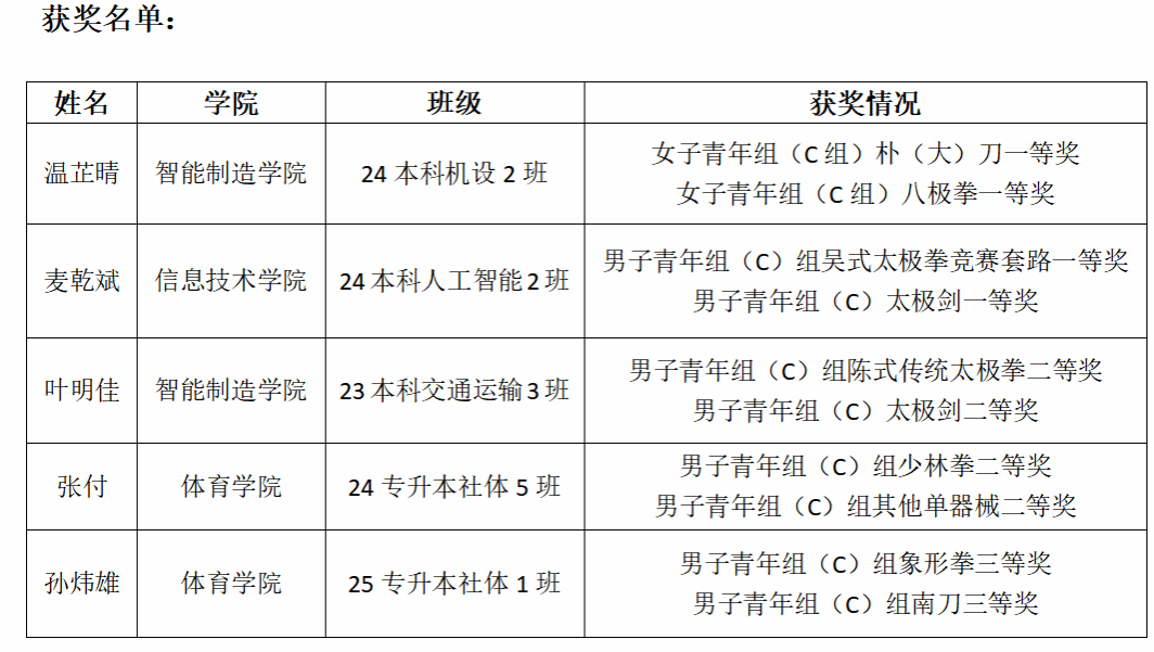 本网讯(体育学院融媒体中心)在刚结束的2025年“掬水帘杯”全国传统武术比赛(广东赛区)的比赛中,学校武术队奋勇拼搏、表现卓越,最终斩获4项一等奖、4项二等奖、2项三等奖的优异成绩,为学校赢得了荣誉。