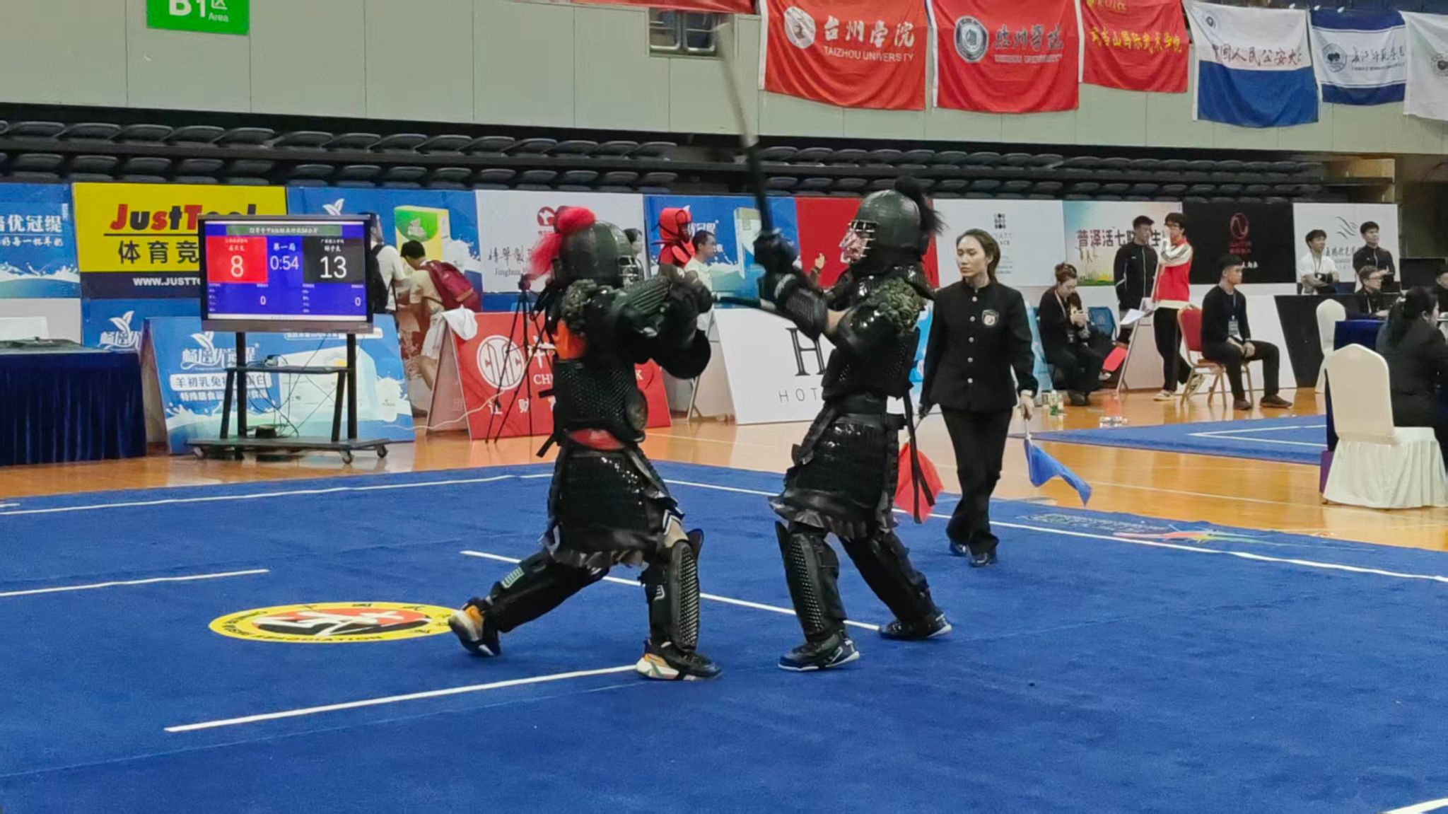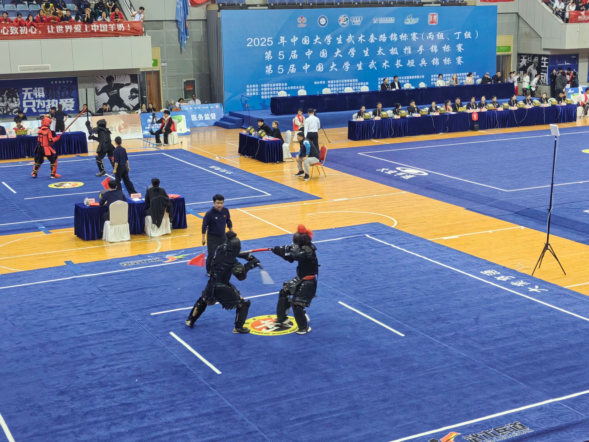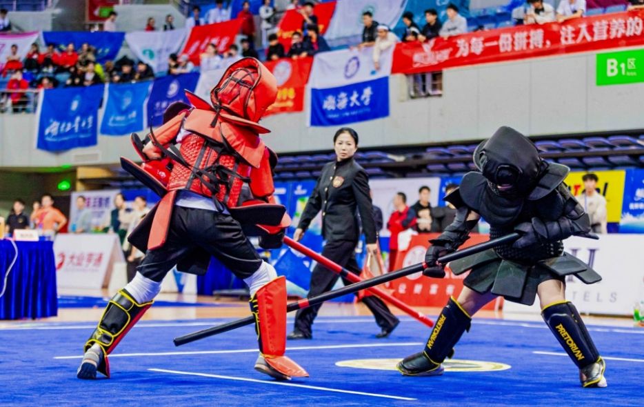 本网讯(体育学院)2025年10月25日至11月1日,第五届中国大学生武术长短兵锦标赛在江苏省南通市隆重举行。本届赛事由中国学生体育联合会主办,共吸引全国94余所高校的981余名运动员参赛,规模再创历史新高。比赛设甲A、甲B、丙组三个组别,涵盖长兵、短兵多个公斤级项目,全面展现了当代大学生精湛的武术技艺与昂扬的精神风貌。
