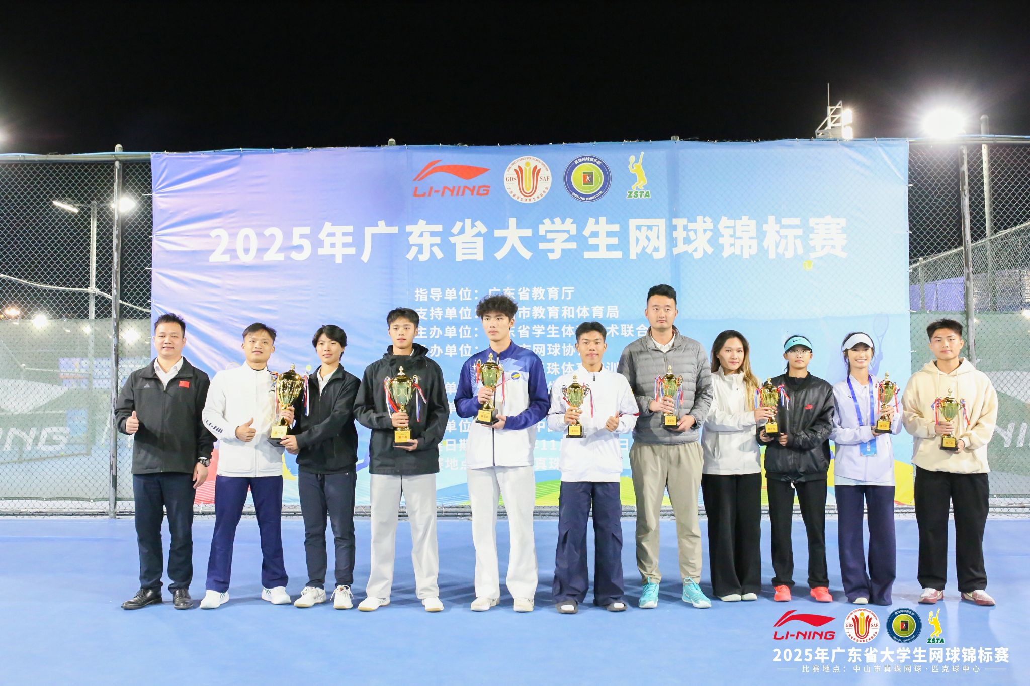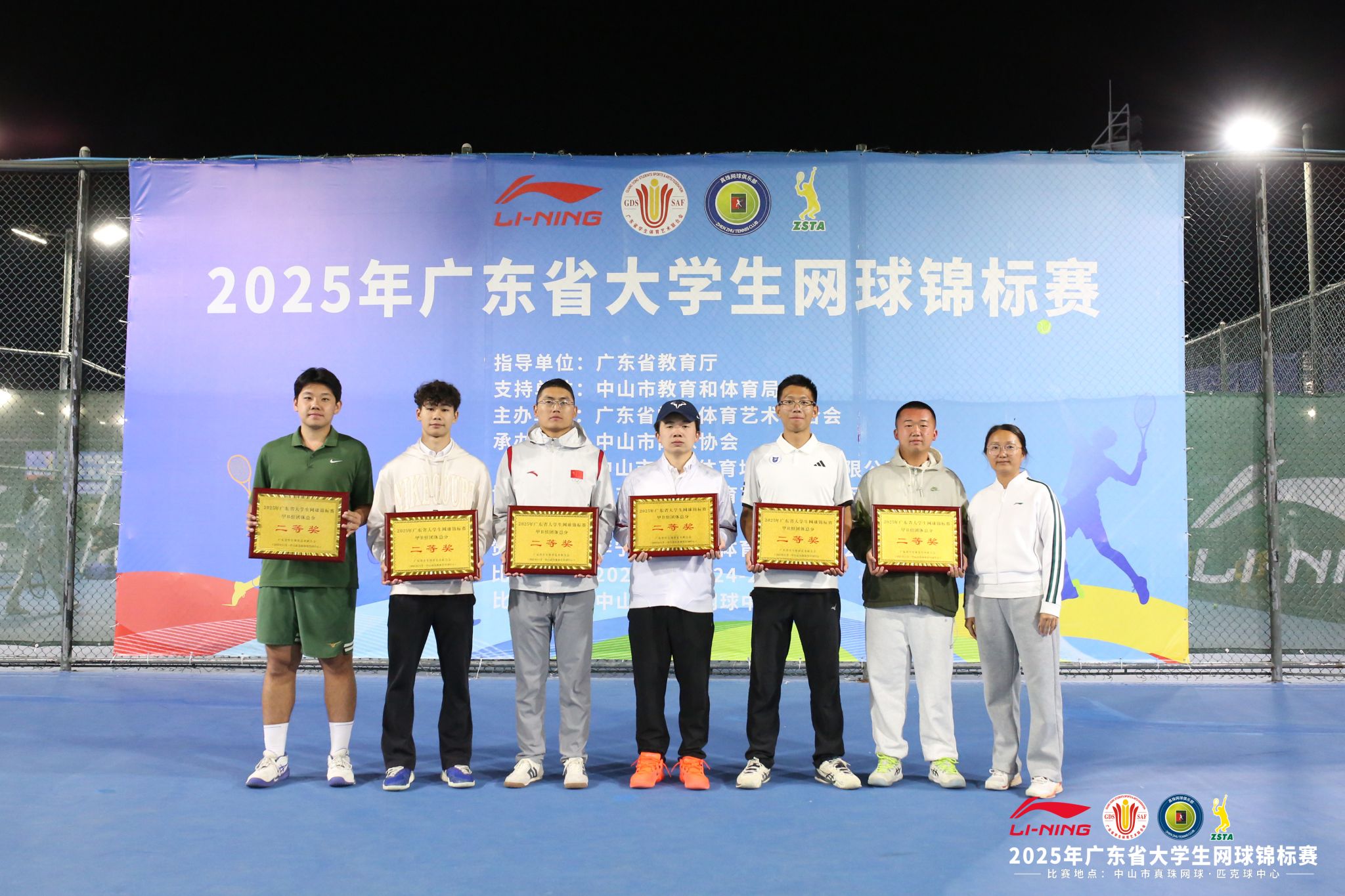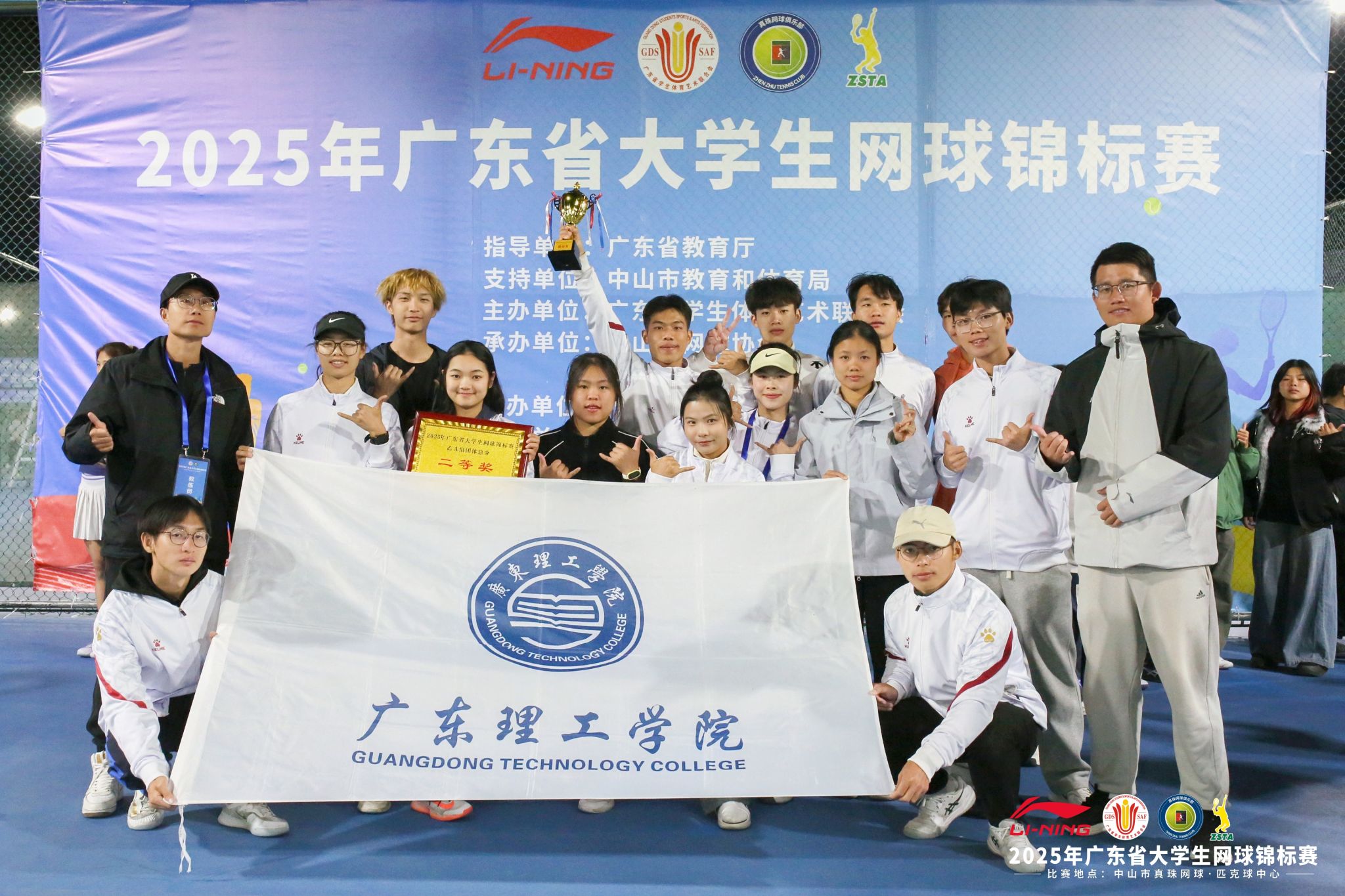 本网讯(体育学院)由广东省学生体育艺术联合会主办的2025年广东省大学生网球锦标赛在中山真珠网球中心圆满落幕。本次赛事于11月24日至28日激情开赛,汇聚全省高校646名网球精英同台竞技。beat365在线唯一官网网球队由体育学院院长肖斌担任领队,夏磊、刘涛、胡进城三位老师担任教练员,派出18名运动员参赛,凭借扎实的技术功底、默契的团队协作与顽强的拼搏精神,在各组别赛事中捷报频传,最终斩获乙A组团体总分一等奖,甲B组团体总分二等奖。用实力书写青春荣光。
