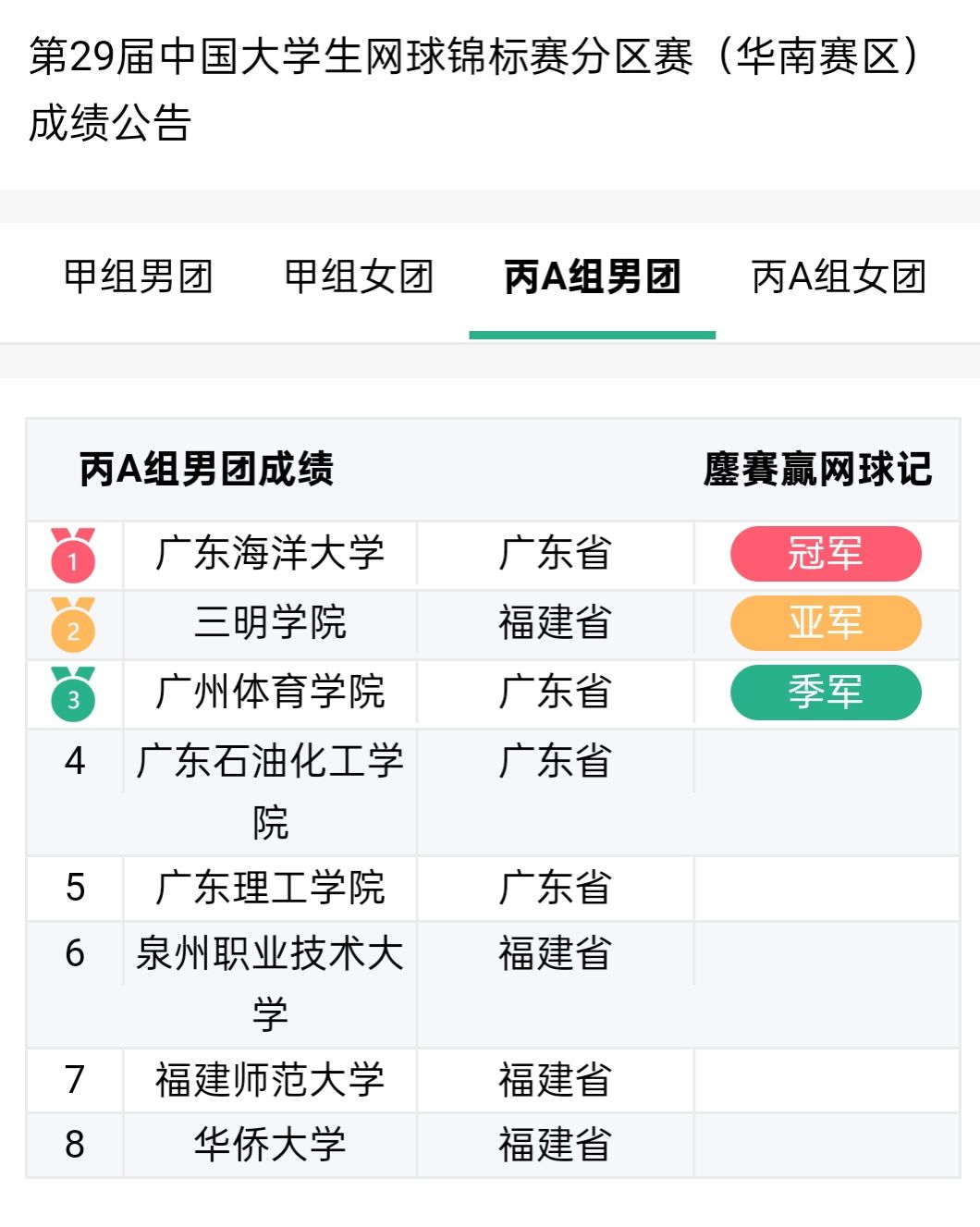 本网讯(体育学院)12月6日,由中国学术体育联合会主办的第29届中国大学生网球锦标赛(华南赛区)在福建省晋江市全民健身中心网球馆圆满落幕。beat365网球队在体育学院党委书记苏庚华的带领下,由夏磊、刘涛、胡进城三位教师担任教练,12名参赛学子奋勇拼搏,最终斩获丙A组女子团体亚军、丙A组男子团体第五名、丙A组团体一等奖的优异成绩,创下beat365网球队团体赛事历史最佳战绩。