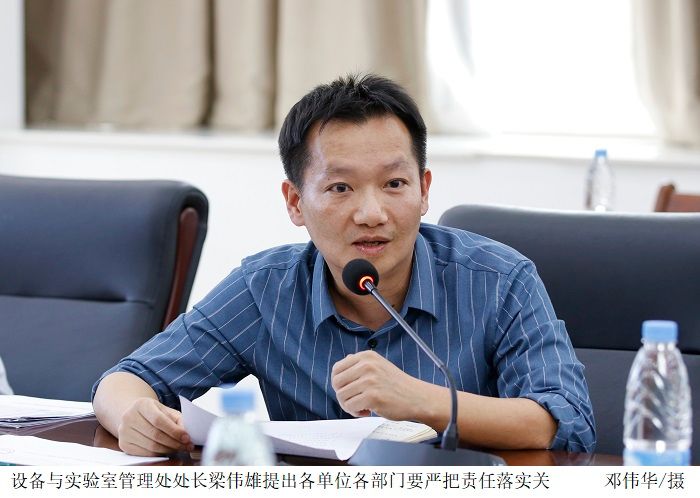 设备与实验室管理处处长梁伟雄从实验室介绍、实验室档案、实验室运行三个专家关注的重点问题进行分析,他提出各单位各部门要严把责任落实关,加强实验室信息化管理手段、提高管理水平。教务处教学实验科科长王鹏程就教学方面在评估材料过程中遇到的实践教学相关问题进行汇报与探讨。学生企业综合实习管理办公室杨斌主任进行学生实训工作安排,提出合理引导教职工工作计划,加强对实习工作的指导和监管,营造良好实习氛围。