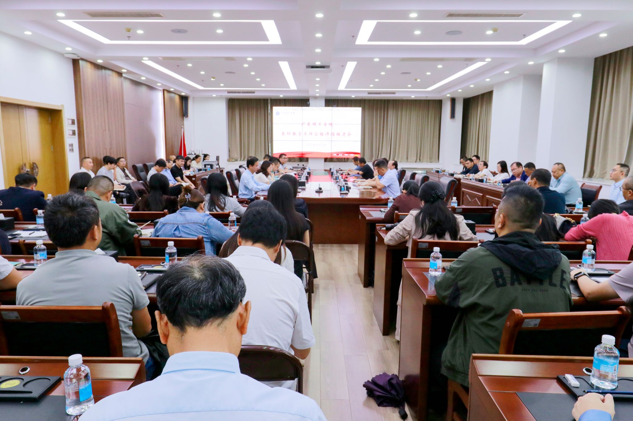 本网讯(教学质量监测与评估中心)10月21日上午学校在高要校区综合楼12楼会议室召开本学期的第7次本科教学合格评估工作推进会。全体校领导、党群及行政管理服务部门主要负责人、各教辅单位主要负责人、各教学单位党政领导班子、教学质量监测与评估中心全体成员参加会议,会议由常务副校长柴维斯主持。
