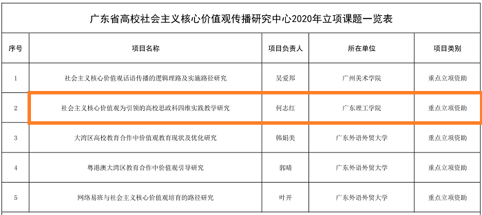 本网讯(宣传部 杨文丹)近期,广东省高校社会主义核心价值观传播研究中心开展了课题招标工作。经招标、专家评审、公示等环节,于9月1日评选出了5项重点立项资助课题、10项一般立项资助课题。 beat365马克思主义学院何志...