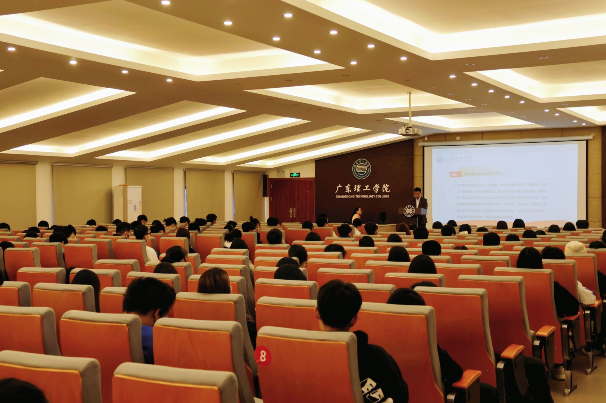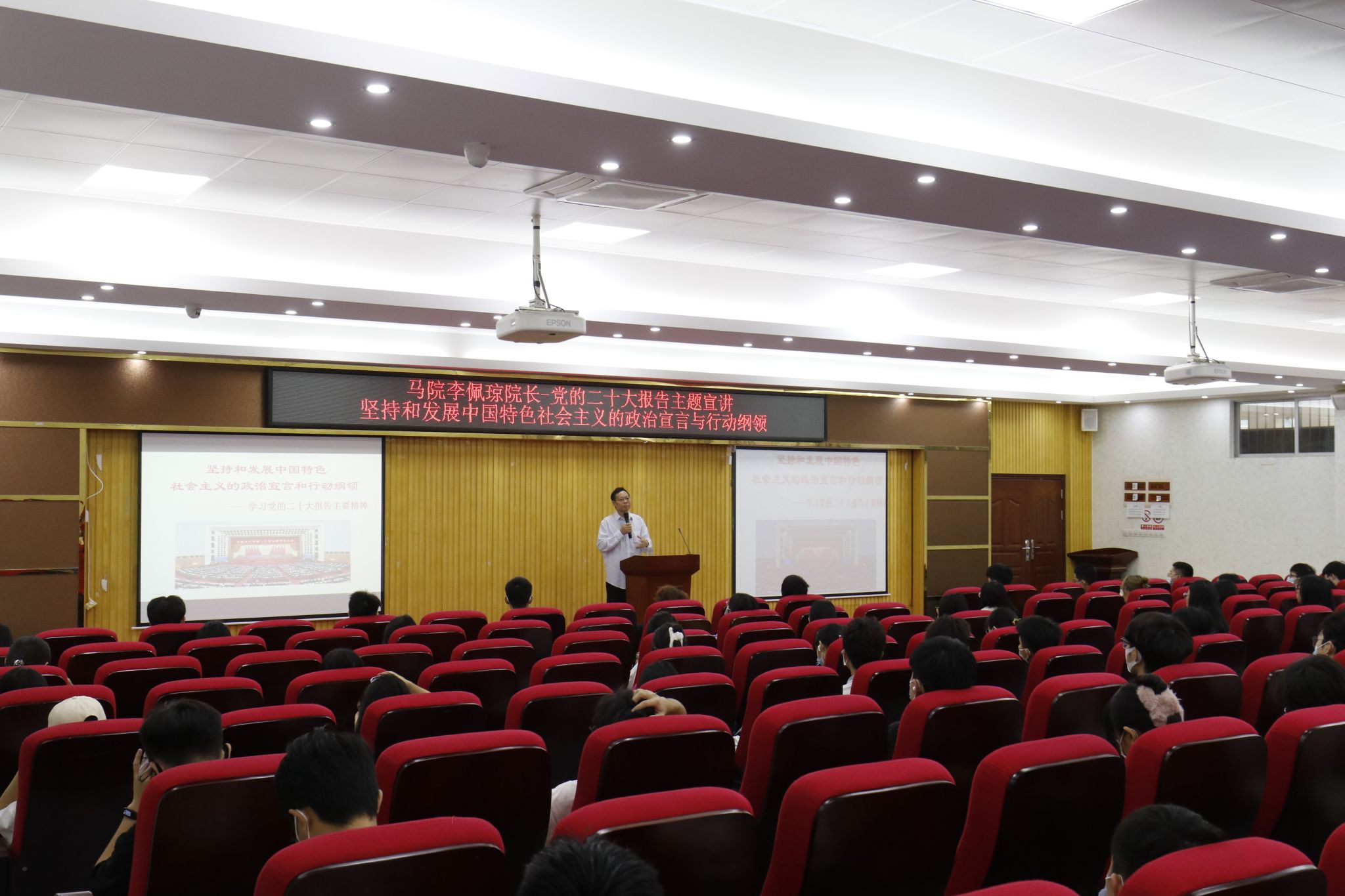 本网讯(马克思主义学院 蔡瑞菁)11月29日上午9时,马克思主义学院院长李佩琼在42栋101报告厅作《坚持和发展中国特色社会主义的政治宣言和行动纲领——学习党的二十大报告主要精神》主题宣讲,马克思主义学院教师蔡瑞菁主持,2022级本科工业工程、2022级本科机械电子工程、2020级本科商务英语、2021级本科商务英语等专业共计120名学生参加。李佩琼向师生系统讲解了党的理论创新的法宝——“六个坚持”、中国式现代化的特征和本...