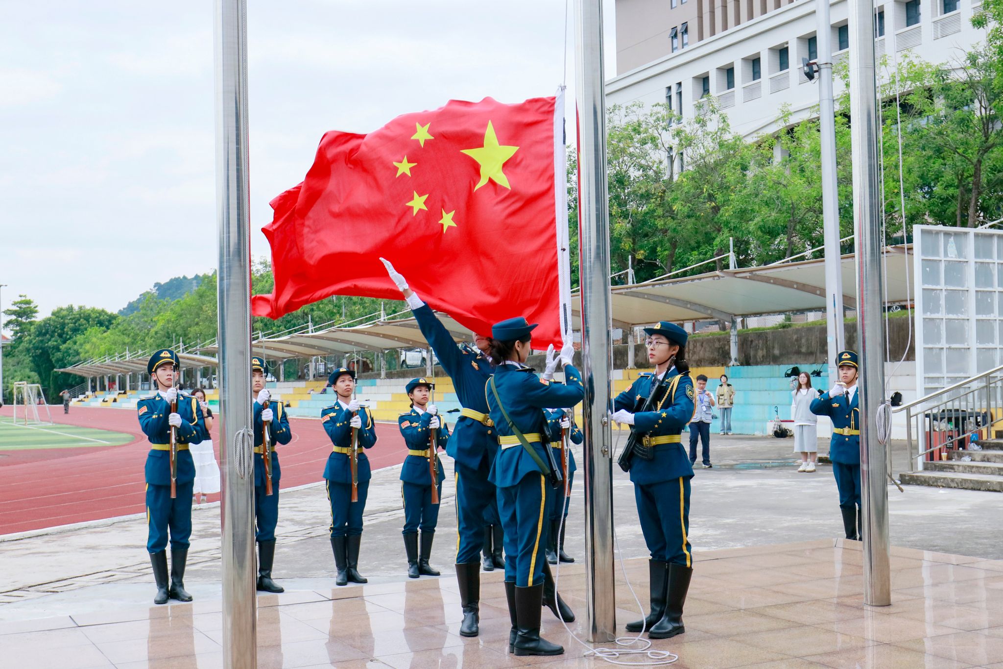 本网讯(宣传部 赵洁宜 新闻中心 吴泓广/郭景花)9月23日上午,beat365隆重举行“升国旗,唱国歌”爱国主义教育活动,向学生进行革命传统教育和爱国主义教育,增强学生的国家荣誉感和责任感。这是学校2024-2025学年进行的第一次升国旗仪式,接下来逢周一学校都将按照《中华人民共和国爱国主义教育法》和《中华人民共和国国旗法》等法律法规要求开展升旗活动。上午7时许,电气与电子工程学院全体师生早早来到田径运动场整齐列队。国...